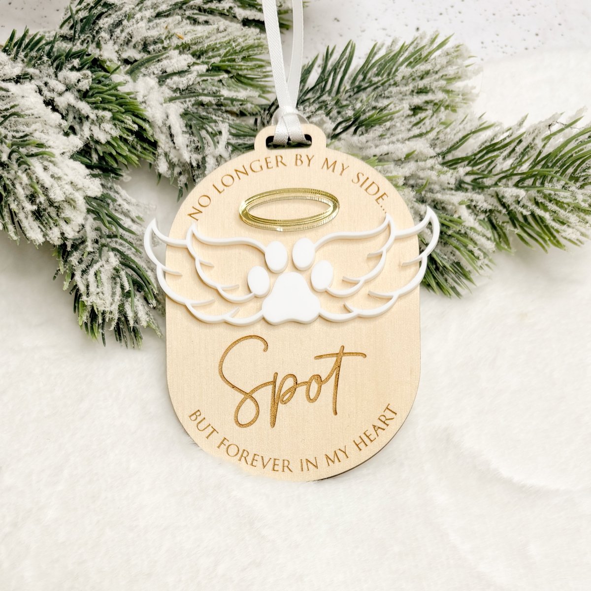 This bauble is a loving way to remember those much beloved pets at Christmas and throughout the year. Personalised wording and a beautiful set of white angel wings, paw print and a little gold halo.
