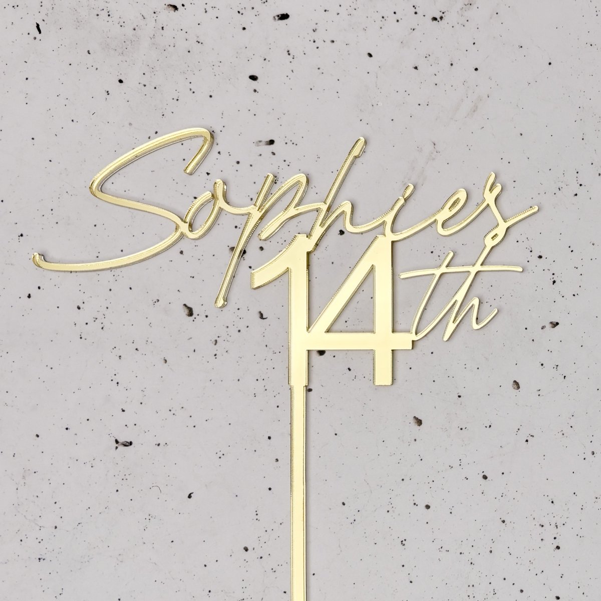 Personalised Name & Age Birthday Party Cake Topper in Mirror Gold Acrylic
