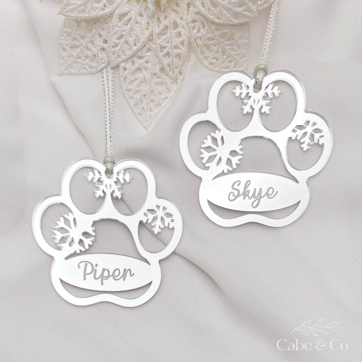 Personalised dog or cat memorial ornament for your Christmas tree. Designed in the shape of a dog paw print, with snowflake design and angel wings, the perfect addition to your Christmas decor. Such a loving way to remember those pets who have touched your life in such a beautiful way.
