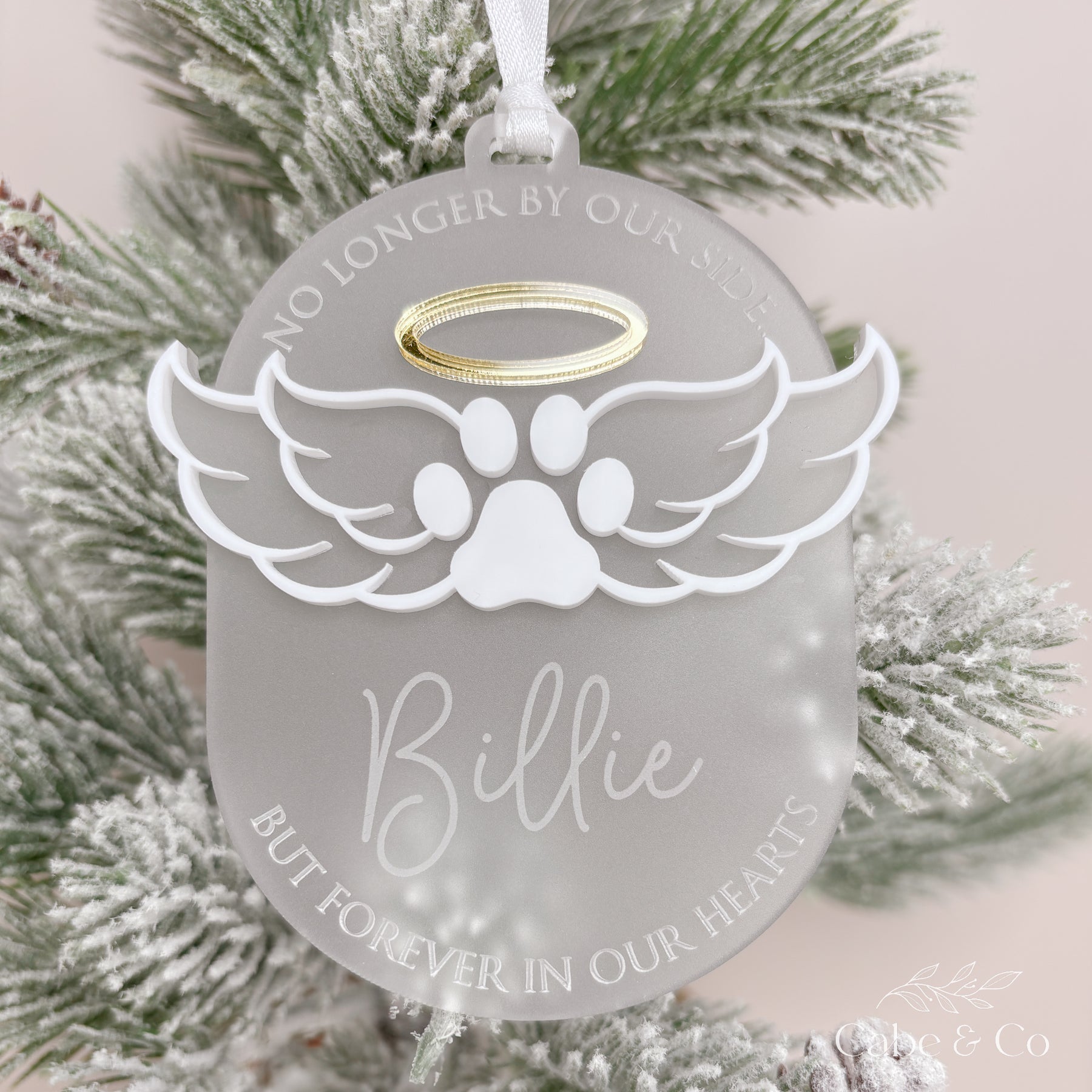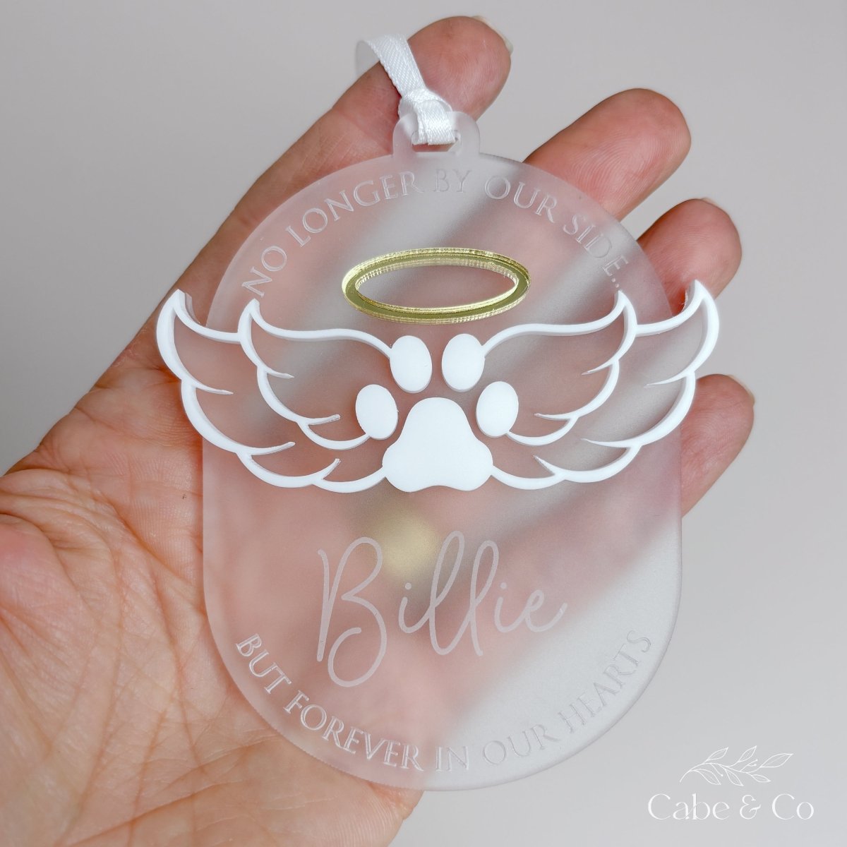 This bauble is a loving way to remember those much beloved pets at Christmas and throughout the year. Personalised wording and a beautiful set of white angel wings, paw print and a little gold halo.